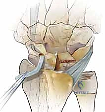 * Using a #15 blade, make the first incision along the dorsal rim of the radius, extending distally to the center of the lunate fossa. This incision opens the radiocarpal joint capsule.