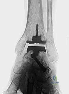 TECH FIG 5 • Subtalar arthrodesis. A. Postoperative AP view with subtalar arthrodesis using a single OA cancellous screw.