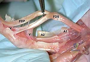 FIG 1 • Structures on the volar aspect of the metacarpals and phalanges. The flexor digitorum profundus (FDP) and flexor digitorum superficialis (FDS) tendons are intimately associated with the volar aspect of the phalanges and, to a lesser extent, the metacarpals. This dissected specimen also depicts the vinculae (V) and the A-1 and A-2 annular pulleys.