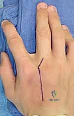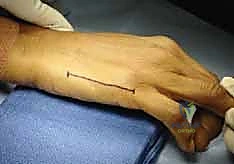 FIG 2 • A. Skin incision used for a dorsal approach to a third metacarpal malunion. The longitudinal limb of the skin incision runs between the metacarpals, and depending on whether the malunion is proximal or distal, the appropriate end is curved.