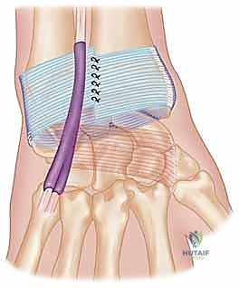 - Oblique Imbrication of the Retinaculum: "Now, for the final shaping of our sling. We will carefully imbricate the remaining extensor retinaculum." This imbrication is performed obliquely, at a 30 to 40-degree angle, continuing the distal-ulnar to radial-proximal direction. This creates a strong, reinforcing layer over our initial flap. Use non-absorbable sutures (e.g., 2-0 Ethibond) for this layer for long-term stability.