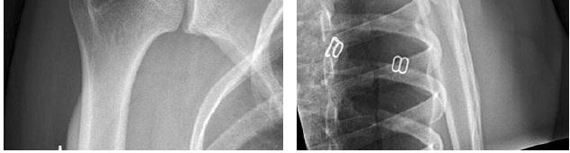 DISCUSSION..The radiograph shows an extra-articular distal clavicle fracture lateral to the clavicular attachment point of the