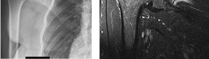 DISCUSSION…The radiographs show a calcium deposit in the supraspinatus tendon. The MRI scan shows a small black signal in the supraspinatus tendon without a tear of the tendon. These findings are consistent with calcific tendonitis. A subacromial injection will help distinguish between the pain from the calcific tendonitis and the chronic fibromyalgia. Pain management is an option after an injection is done for diagnostic purposes. Surgery should not be considered until the diagnosis is confirmed because it will not be successful if the shoulder pain is attributable to the patient’s fibromyalgia.