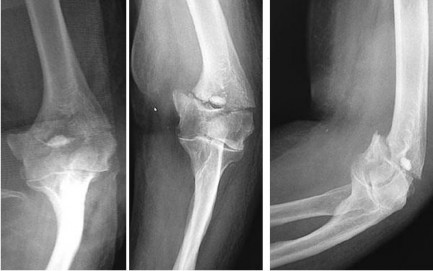 DISCUSSION..Patients with elbow osteoarthritis tend to be active and are often involved in manual occupations that place greater demands on a total elbow implant. Such patients are most often treated with nonprosthetic options because of concerns about prosthetic longevity. As a result, few cases of primary osteoarthritis are included in published studies. However, complications such as stem fracture and aseptic loosening appear to be more common in this population than in any other subgroup, including revision patients. The poor soft-tissue quality associated with rheumatoid arthritis leads to a high-risk ligamentous attenuation and is a general contraindication to use of an unlinked implant. The same poor soft tissue leads to a higher rate of triceps insufficiency and wound dehiscence.