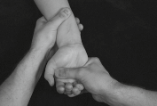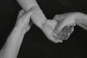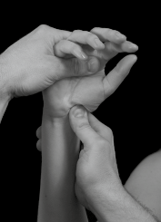 Seated facing the patient, the examiner places the thumb in the palm and wraps the fingers around the metacarpals on the dorsum of the hand. The thumb of the second hand is placed over the tubercle of the scaphoid and counterpressure applied with the other fingers over the dorsum of the lower radius.