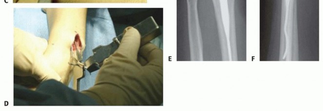 TECH FIG 4 •(continued)C. A rasp is used to create a path for the implant. D. The implant is placed using the insertion device so as to control rotation during seating. E,F. An unstable metaphyseal distal radius fracture has been reduced and stabilized using a dorsal intramedullary device (Tornier Corp). (E,F: Copyright Thomas R. Hunt III, MD.)