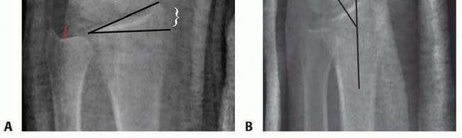 Posteroanterior (PA), lateral, and oblique radiographic views are critical in evaluating all suspected distal radius fractures.Consider imaging the uninjured wrist for comparison and to serve as a template for surgical reconstruction.Radiographs of the elbow should be obtained in almost all cases, especially if any tenderness, swelling, or deformity is detected clinically.Radiographic measurements taken from the PA view ( FIG 2A) include the following14,24:Radial inclination, which is the angle between a line perpendicular to the shaft of the radius at the articular margin and a line along the radial articular marginNormal angle: 21 degreesRadial length, which is the distance from a line tangential to the ulnar articular margin to a line drawn perpendicular to the long axis of the radius at the radial styloid tipNormal length 4: 9 to 11 mmUlnar variance, which is the distance from a line perpendicular to the long axis of the radius at the sigmoid notch and a line tangential to the ulnar articular surfaceNormal length 4: 0 mmLateral articular (volar) tilt is the angle between a line for the articular surface of the radius and a perpendicular line to the long axis of the radius.Normal angle: 11 degrees volar tilt ( FIG 2B)4,14,24Computed tomography (CT) scans can fully elucidate the anatomy of the fracture, particularly articular disruption or incongruity. They also help to determine the necessary surgical approach by defining the location and extent of comminution.CT scans increase the interobserver reliability of treatment plans and may actually alter the initial treatment plan based on plain radiographs. 7P.295Axial views provide a clear view of the DRUJ, which aids to identify subluxation, dislocation, bony fragments, and radioulnar ligament avulsions. 19Magnetic resonance imaging (MRI) is used in cases when the presence of a fracture is uncertain. 19MRI can be useful in evaluating for concomitant ligamentous injuries, TFCC injuries, stress fractures, and occult carpal fractures.