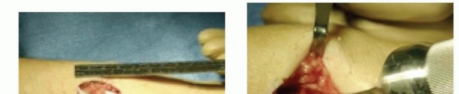 TECH FIG 4 • A. A 2.5-cm dorsal incision is used for exposure. B. The awl is inserted through the fracture site after removal of the tubercle of Lister.(continued)