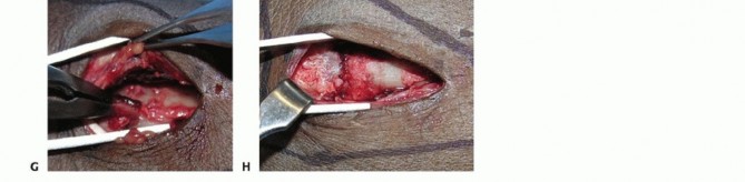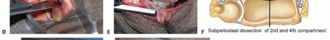 TECH FIG 1 •(continued)D. Exposing EPL by incising the septa of the third dorsal compartment. E. Subperiosteal elevation of the second and fourth dorsal compartments. F. Diagram demonstrating the transposition of EPL and dissection deep to the extensor compartments. G. Removal of tubercle of Lister. H. Exposing the radial shaft with a periosteal elevator. The tubercle of Lister is almost always involved in the fracture and should be completely removed using a rongeur ( TECH FIG 1G).The radius shaft is exposed with a periosteal elevator ( TECH FIG 1H).