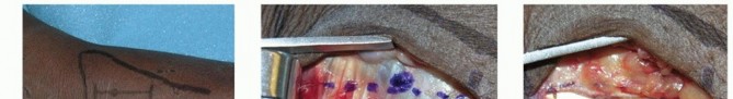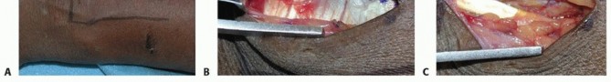 TECH FIG 1 • A. Skin incision is drawn in relation to the tubercle of Lister. B. Skin incision is carried down to extensor retinaculum. Tubercle of Lister and retinacular incision are drawn. C. The retinaculum is incised and the EPL tendon is exposed. Hematoma has already been evacuated.(continued)