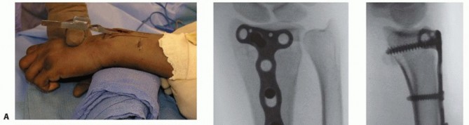 All radiographic imaging must be reviewed before surgery.It is helpful to compare radiographs of the injured wrist to the uninjured wrist.Displaced intra-articular fragments must be identified and consideration given to the value of obtaining CT.P.296Dorsal comminution must be evaluated to determine fracture stability and the need for bone grafting. The distal extent of the fracture must be determined to enable the buttress plate to function properly. Bone should be evaluated for osteopenia, osteoporosis, and tumors.