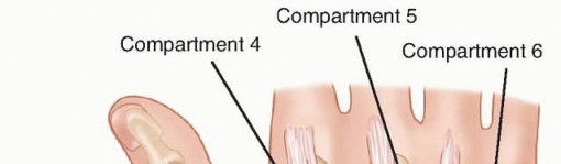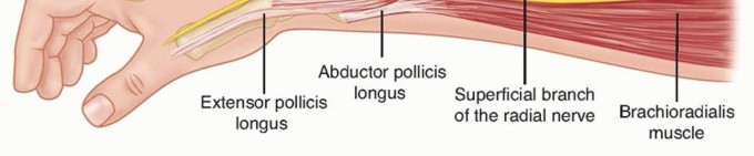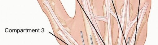 The distal radius consists of three articular surfaces: the scaphoid fossa, the lunate fossa, and the sigmoid notch.Ligamentotaxis aids in the reduction of intra-articular and comminuted fractures.Volar extrinsic ligamentous attachments include the radioscaphocapitate, long radiolunate, and short radiolunate ligaments.Dorsal extrinsic ligamentous attachments include the radiotriquetral ligament.Dorsal and radial to the second metacarpal lie the first dorsal interosseous muscle and the terminal branches of the radial sensory nerve.The distal radial sensory nerve branches lie superficial to the distal radius and should be protected during dissection and pin placement.The radial sensory nerve emerges between the brachioradialis and the extensor carpi radialis longus (ECRL) muscle bellies ( FIG 1).The terminal branches of the lateral antebrachial cutaneous nerve lie superficial to the forearm fascia at the radial wrist.There is a bare spot of bone between the first and second dorsal compartments in the region of the radial styloid.The brachioradialis tendon inserts onto the radial styloid deep to the first dorsal compartment.The ECRL and the extensor carpi radialis brevis (ECRB) lie dorsal to the brachioradialis in the second dorsal compartment.Lister tubercle is dorsal, with the extensor pollicis longus (EPL) tendon on its ulnar side, in the third dorsal compartment.P.253The extensor digitorum communis tendons lie over the dorsal ulnar half of the distal radius in the fourth dorsal compartment.The extensor digiti minimi lies over the DRUJ in the fifth dorsal compartment.