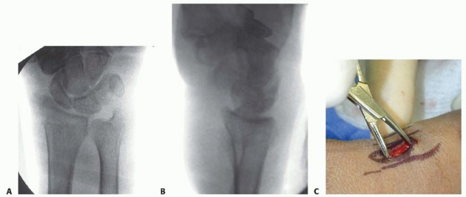 TECH FIG 3 • A,B. PA and lateral views demonstrating reduction of distal radius fracture. C. The incision is made over the radial styloid.(continued)