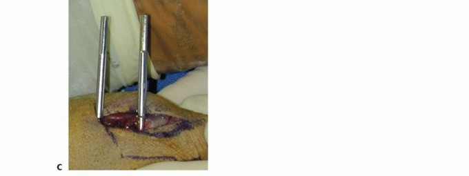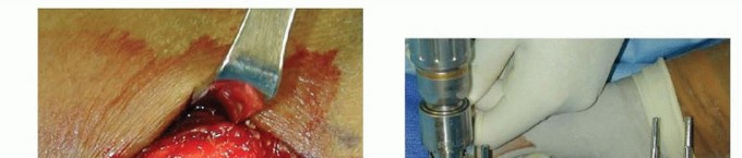 TECH FIG 5 • A. Incision over the radial forearm demonstrating the radial sensory nerve branch deep to the fascia. (The hand is to the right.) B. The double drill guide is placed onto the radius.(continued)
