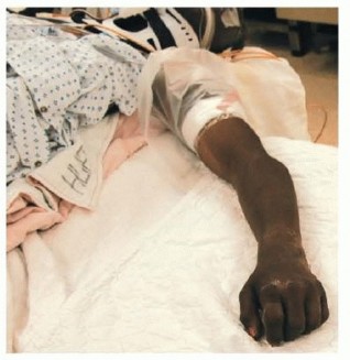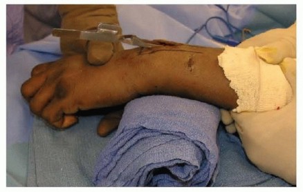 FIG 3 • Positioning of patient supine on the hand table with tourniquet in place.