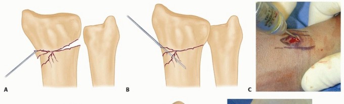 TECH FIG 2 • A. An incision is made over the radial styloid, and a K-wire is manually inserted into the fracture site. B. The wire is levered distally to correct the radial inclination. C. The wire is advanced proximally, using power, into cortical bone. D. An incision is made over Lister tubercle, and a wire is inserted into the fracture site. E,F. The wire is levered distally to correct the dorsal angulation and advanced proximally using power into cortical bone.