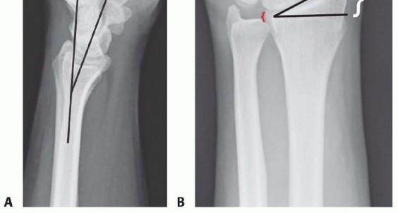 Distal radius fractures needing no reduction and those that are stable after reduction typically recover functional range of motion with minimal long-term sequelae.Three parameters that affect outcome include articular congruity, angulation, and shortening. 21,26Two millimeters or more of articular surface incongruity of the distal radius can lead to degenerative changes, pain and stiffness.Dorsal angulation can lead to decreased range of motion and increased load transfer to the ulna. Radial shortening can lead to decreased range of motion, pain, and ulnar impaction of the carpus.