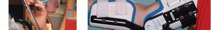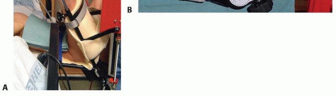 FIG 2 • A. Elbow continuous passive motion device. B. Patient-adjusted static elbow brace. Because the collateral ligaments are not released at surgery, no restrictions are typically placed on therapy.3Static progressive elbow bracing is begun early in the postoperative period. The brace is worn for about 30 minutes, two or three times a day. Flexion and extension are alternated based on the preoperative deficit and the early progress of the elbow (FIG 2B).Commercially available braces should be obtained preoperatively, as trying to secure them postoperatively can delay the onset of their use.A nonsteroidal anti-inflammatory agent (Indocin) is commonly prescribed as a prophylaxis against heterotopic ossification for several weeks postoperatively. This also helps to limit inflammation of the joint and soft tissues during rehabilitation.P.1188Patients are typically discharged home on postoperative day 1. Home therapy is performed daily thereafter, including active and passive exercises, continuous passive motion, weighted stretches, and patient-adjusted bracing.Progress should be closely monitored by a therapist who is familiar with the protocol. The physician must also follow these patients closely.Although the bulk of ultimate elbow motion is gained during the first 6 to 8 weeks, patients can continue to make gains in terminal flexion and extension for several months postoperatively. This is especially true forelbow flexion.Continuous passive motion is typically discontinued at 3 to 4 weeks, but bracing is continued for several months as required. As long as the patient is able to obtain full elbow flexion and extension once per day (eg, in the brace), a favorable prognosis exists with respect to the ultimate outcome if vigilance is maintained.