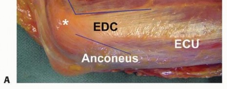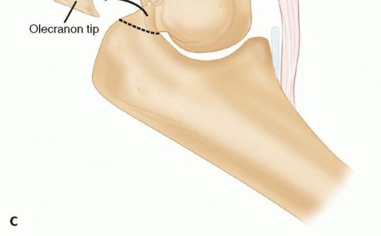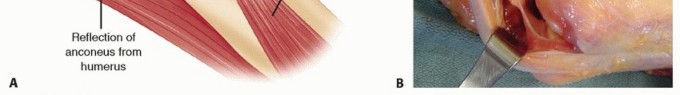 A direct posterior skin incision or a lateral incision is used.A direct posterior incision has been criticized for an increased propensity toward postoperative seromaformation.It has the advantage of being a utilitarian incision that allows access to the medial and lateral sides simultaneously.Advantages to the lateral exposure include its simplicity, less extensor and flexor-pronator disruption, and access to all three joint articulations.The main disadvantage of the lateral exposure is the inability to address the ulnar nerve and posterior bundle of the ulnar collateral ligament when indicated.The deep interval for exposure of the anterior capsule lies between the extensor carpi radialis longus (ECRL) proximally and the extensor carpi radialis brevis (ECRB) distally. Posterior access is achieved between the triceps and the humerus.