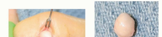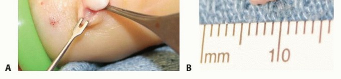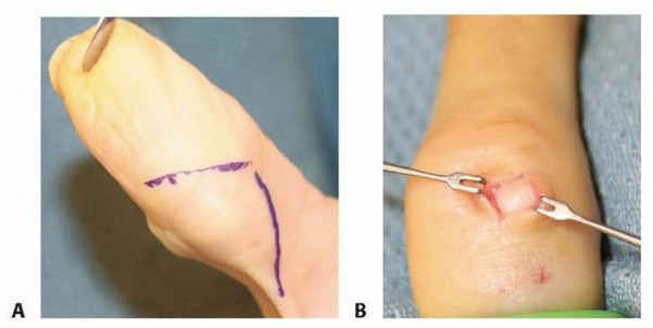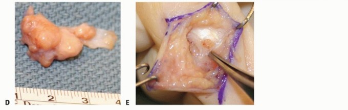 TECH FIG 5 • A. Careful surgical dissection of the subcutaneous tissues through a Brunner incision. B. The digital nerve is identified distal to the lesion and protected throughout the procedure. C. The tumor should be carefully removed from surrounding soft tissues. D. Excision demonstrates a firm, multinodular lesion. E. Any satellite lesions should be carefully identified and removed. Carefully examine the local tissues for satellite lesions, which may be only a few millimeters in size. These lesions need to be completely excised (TECH FIG 5E).If the extensor tendon is involved, surgical excision of a portion of the tendon may be required. In rare cases, tendon reconstruction may be necessary. Lesions eroding into bone may require local curettage.If the tumor appears to arise from an underlying joint, it is important to perform a capsulotomy to inspect the joint and débride any pigmented tissue.11Arthrodesis of the distal interphalangeal joint may be necessary to completely excise some lesions.7. Marginal Excision of an Epidermal Inclusion CystCareful surgical dissection is undertaken under loupe magnification.After initial exposure, isolate the neurovascular bundles in the area of the lesion.Once the capsule is identified, it can be sharply dissected from overlying skin and bluntly dissected from deeper soft tissues (TECH FIG 6). TECH FIG 6 • A. Through a small longitudinal incision directly over the lesion, the cyst is bluntly excised from surrounding soft tissues. B. Excision of the lesion demonstrates a firm, white, encapsulated mass. Take care to remove the entire capsule.Lesions eroding into bone may require local curettage and bone graft.In rare cases with advanced bony destruction, amputation is an alternative.P.1321