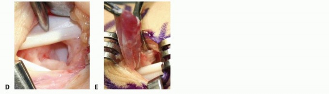 Open Excision of a Dorsal Wrist Ganglion Cyst C. The extensor retinaculum is incised transversely. D. The extensor tendons are retracted, allowing visualization of the cyst. E. Cyst stalk arising from the dorsal scapholunate ligament.(continued)