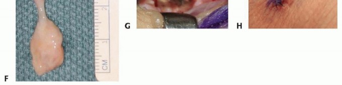 TECH FIG 1 •(continued)F. Excised cyst and stalk. G. The area of origin of the cyst is cauterized, taking care to preserve the ligament and interosseous membrane. H. Closure with running subcuticular suture.