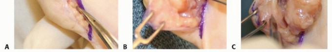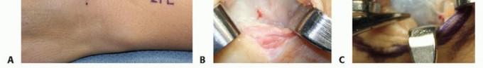 TECH FIG 2 • A. A Brunner type of incision allows for more exposure and avoids contracture associated with straight longitudinal incisions in this location. B. A volar cyst adherent to the radial artery and venae comitantes. C. A volar wrist ganglion stalk arising from the volar radiocarpal ligaments.