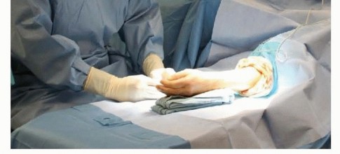 FIG 4 • The patient is positioned supine with an arm board attached to the operating table and the upper extremity is prepared and draped in a standard manner. The surgeon is generally seated in the axilla with full access to the hand and wrist.