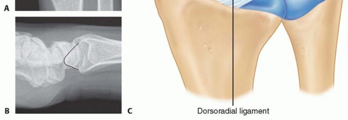 FIG 1 • A,B. The radial styloid outlined on a standard posteroanterior (PA) and lateral wrist radiograph. C. Palmar and dorsal extrinsic ligaments of the radiocarpal joint. Note the broad origin of the dorsoradial ligament. The RCL originates from the tip of the styloid. The RSC and LRL ligaments are separated by a well-defined sulcus readily seen arthroscopically.