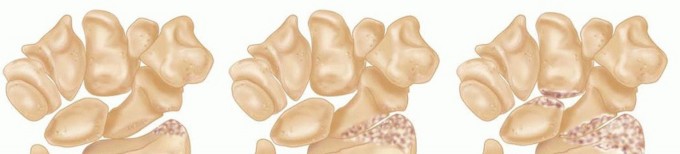 FIG 3 • Stages of arthritis with SLAC. SLAC I: degenerative changes are confined to the radial styloid. SLAC II: joint space narrowing of the entire radioscaphoid articulation. SLAC III: chondral changes in the radioscaphoid and capitolunate joint.