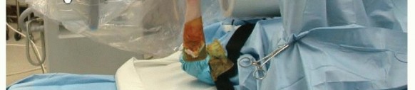 FIG 6• Arthroscopic findings of full-thickness cartilage loss in the entire scaphoid facet (dashed line) and proximal pole of the scaphoid as viewed from the dorsal 3-4 portal. These degenerative changes were not readily apparent on plain radiographs. An isolated radial styloidectomy cannot be expected to confer pain relief in this instance.P.971Alternatively, the hand can be suspended via finger traps using a nonsterile overhead traction boom (ie, an arthroscopic shoulder holder); with this method, the wrist traction tower will not be an impediment to intraoperative fluoroscopic assessment (FIG 7).