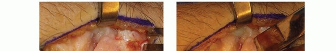 TECH FIG 1 • Open radial styloidectomy. A. A 2- to 3-cm oblique skin incision is made between the first and second extensor compartments. Note the branches of the radial sensory and lateral antebrachial cutaneous nerves. B. The first dorsal compartment is then opened.(continued)