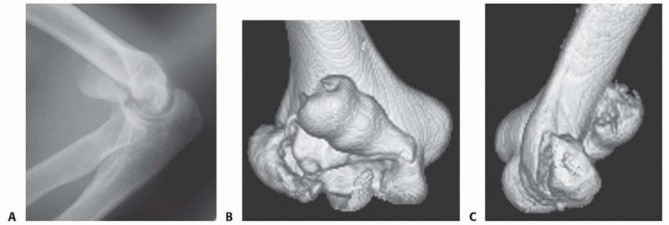 Diagnosis1.Diligence should be paid to identifying concomitant injuries such as elbowdislocations, radial head fractures, and ligamentous instability.Imaging1.Plain radiographs are insufficient, and a CT scan should be considered routinely.2.Order 3-D reconstructions if possible.Nonoperativemanagement1.Nonoperative management should be chosen cautiously. Anatomic and stablereduction of the fracture is necessary. Otherwise, a painful elbow with restricted motion may result.2.We do not recommend nonoperative management of any capitellar-trochlear shear fractures.Surgicalmanagement1.Lateral epicondyle osteotomy can enhance exposure.2.A posterior skin incision will afford access to both sides of the joint and an olecranon osteotomy, if necessary.3.Inability to reduce the fracture anatomically may represent impaction of the lateral column and require disimpaction or bone grafting.4.Excision of small comminuted fragments that cannot be fixed internally is preferred over nonanatomic reduction and malunion.5.Concomitant fractures and ligamentous injuries should be treated simultaneously to optimize outcomes.Postoperative ▪ Stable fixation should be sought to facilitate early motion.management ▪ Heterotopic ossification is common after elbow fractures, and prophylaxis with nonsteroidal anti-inflammatory drugs should be considered.