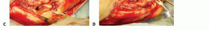 TECH FIG 3 • A. Posterior midline incision used for capitellar-trochlear shear fractures. B. Deep lateral approach to the elbow using the capsular violation to enter the radiocapitellar joint. C. The fracture fragments tend to displace proximally and internally rotate. Note, avulsion of the lateral epicondyle with subsequent retraction allowing for excellent visualization. D. The fracture is reduced and provisionally pinned with 0.045-inch K-wires.