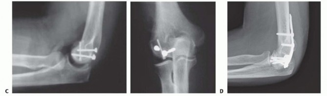 TECH FIG 2 • Fixation of capitellar fractures with (A) anteriorly placed headless compression screws, (B) posteriorly placed headless compression screws, (C) combination of a headless screw anteriorly and cancellous screws posteriorly, and (D) hybrid fixation using anteriorly placed headless compression screws followed by neutralization of the fracture with a locked periarticular plate applied posteriorly. Use of a periarticular locking plate alone or in a hybrid construct with headless compression screws can be of value to improve the stability of the construct ( TECH FIG 2D). This technique will require greater posterior dissection, therefore increasing the theoretical risk of osteonecrosis. However, application of a posterolateral plate can provide posterior stability in cases with posterior cortical extension or comminution.Excision of fracture fragments can be considered in type 2 fractures with small, thin articular pieces and type 3 comminuted fractures where the fragments are not amenable to internal fixation.Fragment reduction and hardware position should be confirmed by image intensifier.Unrestricted forearm rotation and elbow flexion-extension without mechanical block or catching should be confirmed intraoperatively.If the lateral collateral ligament complex is found to be avulsed, it should be repaired back to the lateral epicondyle with drill holes and heavy nonabsorbable sutures or suture anchors.The capsule should be closed.The retracted extensor origin should be relaxed and closed to the surrounding soft tissue.2. Capitellar-Trochlear Shear Fractures