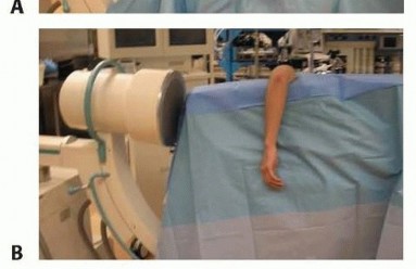 FIG 5 • A,B. Patient positioning for distal humerus fractures. (Courtesy of Samir Mehta, MD.) The contralateral arm is flexed at the shoulder and elbow to 90 degrees and placed on an arm board that is rotated so it is flush with the bed. This arm is then secured to the arm board.The operative arm is laid over a radiolucent arm board or paint roller so that the elbow is flexed 90 degrees (FIG 5).C-arm is brought in to assure that AP and lateral x-rays are adequate. The arm is then prepped and draped sterilely.A sterile tourniquet is used if one is desired.A “brain bag” is placed under the arm to be used to catch any blood or irrigant that comes from the field. The Bovie and suction are also placed in this bag for use.