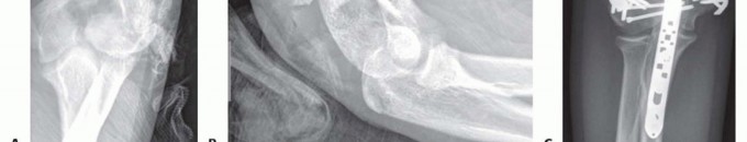High-quality AP and lateral radiographs are mandatory prior to surgery.Internal and external oblique views may be useful in identifying columnar comminution. CT scan can be useful in identifying coronal shear fragments.Method of fixation should be chosen by patient age, degree of displacement, and amount of comminution.Specialized distal humeral plating systems are available from several different manufacturers to allow either bicolumn or “90:90” plating.