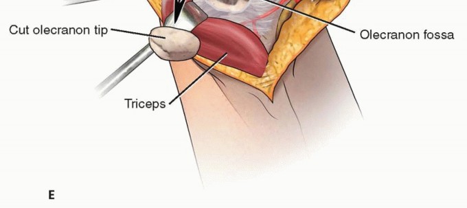TECH FIG 1 •(continued)E. The tip of the olecranon can be resected if more joint visualization is required. Additionally, the anconeus can be subperiosteally reflected if access to the radial head is necessary in the case of a coronal capitellar split. (Adapted from Bryan RS, Morrey BF. Extensive posterior exposure of the elbow: a triceps-sparing approach. Clin Orthop Relat Res 1982;[166]:188-192.)
