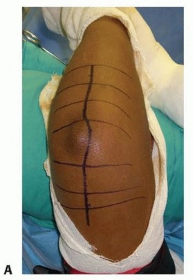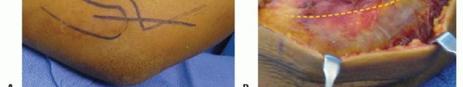 TECH FIG 2 • Modified Wrightington approach. A. Make an 8-cm longitudinal incision at the junction of the ulna and anconeus starting about four fingerbreadths distal to the olecranon and extending 2 cm proximal to the olecranon.(continued)