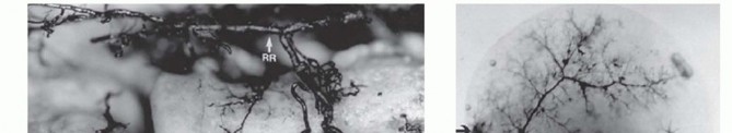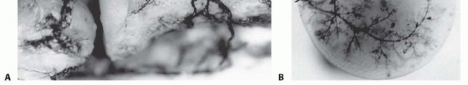 FIG 2 • A. The radial recurrent artery, a branch of the radial artery, provides the main blood supply to the radial head. B. In most cadaveric specimens, a branch of the radial recurrent penetrates the radial head in the safe zone. (From Yamaguchi K, Sweet FA, Bindra R, et al. The extraosseous and intraosseous arterial anatomy of the adult elbow. J Bone Joint Surg Am 1997;79[11]:1653-1662.)