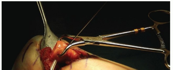 TECH FIG 3 • The modified Wrightington approach allows for full visualization of the radial head and fracture by subluxing the radial head posteriorly out of the joint.