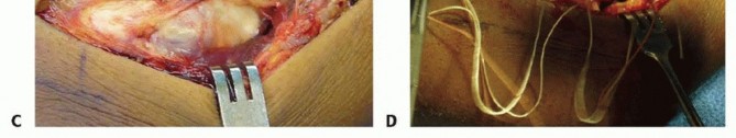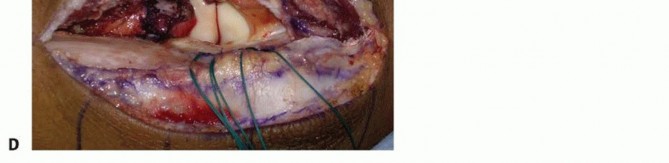 TECH FIG 2 •(continued)B. The interval between the ulna and anconeus is incised sharply, with care taken not to violate the periosteum or muscle to minimize the risk of proximal radioulnar synostosis. C. Blunt elevation of the anconeus is crucial to avoid damaging the capsule or lateral ligament complex. D. The capsule and lateral ligament complex are tagged during the approach to facilitate final repair with suture anchors.