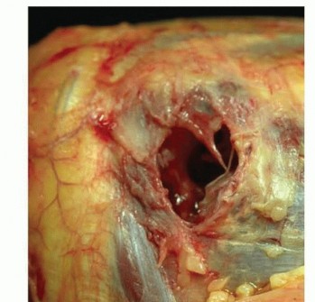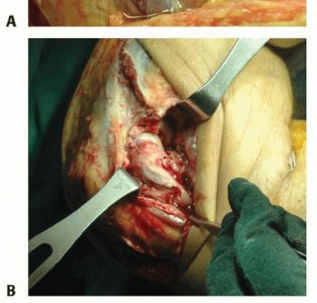 FIG 3 • Soft tissue injuries occur with unstable radial head fractures. Sample pictures showing (A) large capsular rupture and (B) avulsion of the lateral collateral ligament (LCL) and common extensor tendons from the lateral epicondyle.