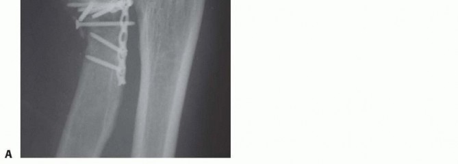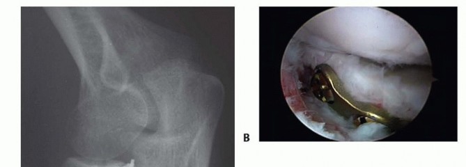 FIG 13 • A. Oblique radiograph demonstrating prominent hardware limiting forearm rotation. B. Arthroscopic view in the lateral gutter demonstrating hardware impingement at the PRUJ.Early and late instability from missed or failed treatment of associated injuriesThe rate of avascular necrosis is about 10%, significantly higher in displaced fractures. This is expected given that the radial recurrent artery inserts in the safe zone where hardware is placed. This is generally clinically silent.Loss of reduction Nonunion ( FIG 14)P.173 FIG 14 • ORIF of radial neck fracture that went on to nonunion and avascular necrosis.