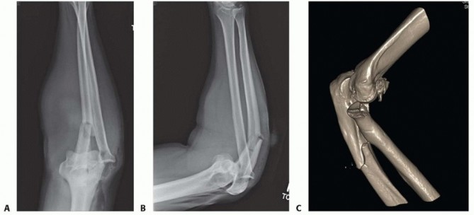 FIG 5 • A,B. AP and lateral x-ray showing a type II Monteggia fracture—posterior dislocation of radial head (or fracture) and proximal ulnar fracture with posterior angulation. C. CT scan clearly showing impaction fracture of the radial head that may not be appreciable on x-ray.