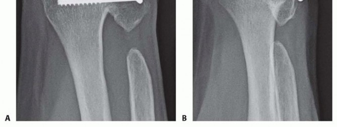 FIG 9 • A,B. AP and lateral radiographs of a Sauvé-Kapandji procedure following traumatic distal ulnar fracture. P.237