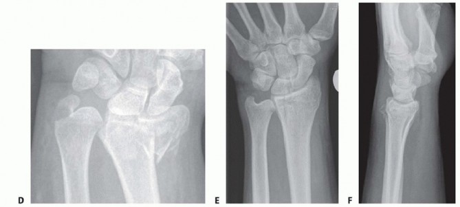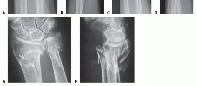 FIG 8 • A,B. This ulnar shaft fracture is by definition within 4 cm of the distal dome of the ulnar head. C,D. This ulnar shaft fracture is more proximal and should be considered an isolated ulnar fracture. However, there may still be involvement in the DRUJ, which needs to be taken into account. The DRUJ should be examined for stability after ORIF. E,F. Unstable distal radius and ulnar fractures are difficult to immobilize with casts alone.