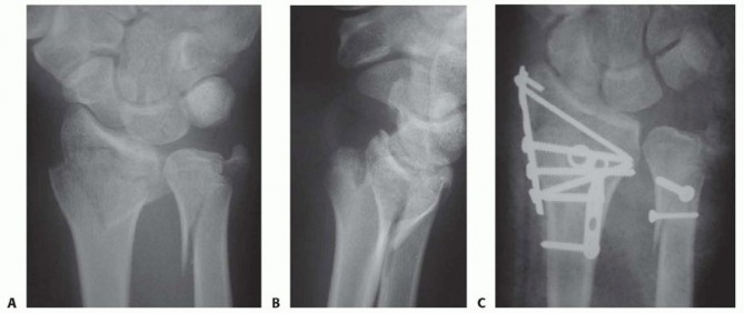 TECH FIG 5 • A,B. AP and lateral radiographs show a dorsally displaced distal forearm fracture. ORIF was performed using both a dorsoradial and a dorsoulnar approach to stabilize the fractures. C. Because of the comminution around the ulnar styloid base, fixation was achieved with a suture loop.6. Comminuted Intra-articular Distal Ulnar FracturesTreatment options exist for comminuted intra-articular distal ulnar fractures:Restoration of the anatomy and overall alignment of the ulna and DRUJ as mentioned earlierThis can be accomplished with manipulation and above-elbow cast immobilization alone or alternatively by surgical means with temporary wiring or external fixation.The potential problems with this management technique are wrist stiffness and reduced forearm rotation that may not be corrected with a late salvage procedure.Primary distal ulnar head replacement 5The theoretical advantage is reduced stiffness (from having early movement) and less DRUJ pain.Total or partial excision of the ulnar head as well as DRUJ arthrodesis with distal ulnar neck resection (Sauvé-Kapandji procedure)Distal ulnar resection with ECU tenodesis (Darrach procedure) 4Care is taken not to resect beyond the proximal portion of the sigmoid notch.