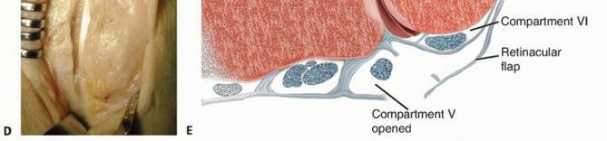 TECH FIG 1 • Surgical approach to all distal ulnar fractures. A,B. A dorsal zigzag incision is made with the center directed toward the DRUJ. C. Subcutaneous dissection should be performed so that the dorsal cutaneous branch from the ulnar nerve is protected. D. The retinaculum is identified and an approach through the fifth extensor compartment is done. E. The retinaculum is elevated as an ulnarly based flap between the true retinaculum and the separate dorsal sheet for the ECU tendon (which should be preserved). The ECU is thereby kept in its tendon sheath.(continued)