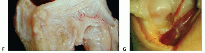 TECH FIG 1 •(continued)F. An ulnarly based capsular flap is raised from the 4-5 septum to gain access to the distal ulna. G. As shown in this dissected specimen, the ulnocarpal joint is often hidden behind the synovium over the meniscus homolog. (C,D: Courtesy of M. Garcia-Elias, Spain.)
